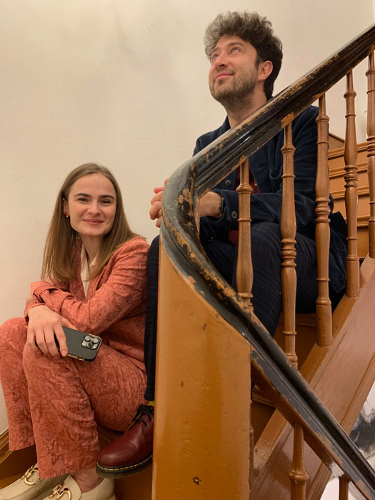 Und um für alle Besucher deutlich zu machen, dass auch das Treppenhaus bereits teilweise von „createPeace“-Künstler:innen erobert ist, spielte dann mein geschätzter Freund Detmar Kurig zu vorgerückter Stunde auch noch im Treppenhaus, diesmal auf einem alten Violone, dem Vorläufer des Kontrabass.