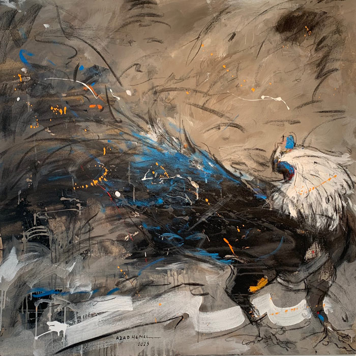 Vor Jahren ist Azad Hemee international bekannt geworden durch seine Darstellungen von Hahnenkämpfen, in denen er die Dramen unseren Zeit zeigte. In seinen jüngsten Arbeiten reduziert Azad immer häufiger auf die Darstellung eines einzigen Hahns, der aber die Dramen unserer Welt weiterhin erahnen lässt. Aus dieser Reduzierung erwächst ein großartiger Zugewinn an Vielschichtigkeit. Wir haben inzwischen entschieden, die Werke Azad Hemees im Herbst dieses Jahres bei uns umfassend zu zeigen