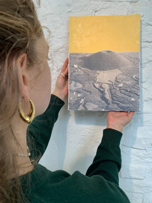 Irgendwann kamen dann immer mehr Pakete mit Werken an von Künstler:innen aus aller Welt. Teilweise haben wir auch im Falle von Fotoarbeiten die Werke hier in Deutschland professionell auf Aludibond drucken lassen, statt eine lange Reise von z.B. Island oder Brasilien in Kauf zu nehmen. Unten erst ein Werk von Sigrún Kristjánsdóttir, darunter eins von Mariana Bassani.