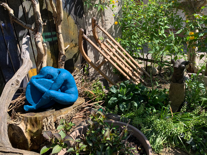 Bei der vorausgehenden Planung hatte ich mich begeistert entschieden, die kunterbunte Begrenzungswand der Außenterrasse vor der Galerie zu bespielen, die bisher noch nie für die Präsentation von Kunst genutzt worden war. Die Wand zierte ursprünglich vor vielen Jahren einen Wagen bei der Love-parade und wurde zunehmend durch Eymelt Sehmer mit Baumteilen, Blumen, Vogelhäusschen usw. zusätzlich belebt.